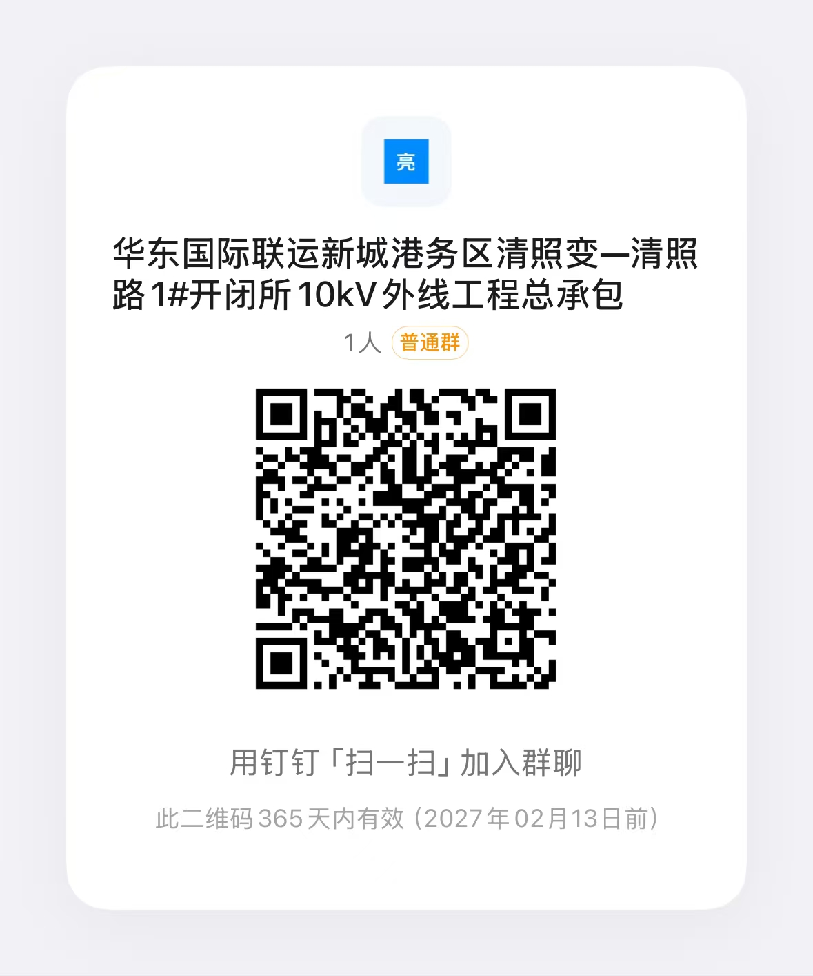 5.5開(kāi)標(biāo)時(shí)間前30分鐘,投標(biāo)人應(yīng)使用釘釘軟件掃描下方二維碼進(jìn)入開(kāi)標(biāo)直播群,開(kāi)標(biāo)全過(guò)程將在釘釘群中進(jìn)行直播(“華東國(guó)際聯(lián)運(yùn)新城港務(wù)區(qū)清照變—清照路1#開(kāi)閉所10kV外線工程總承包”群的釘釘群號(hào): 160160018192)?!叭A東國(guó)際聯(lián)運(yùn)新城港務(wù)區(qū)清照變—清照路1#開(kāi)閉所10kV外線工程總承包”群的二維碼如下: